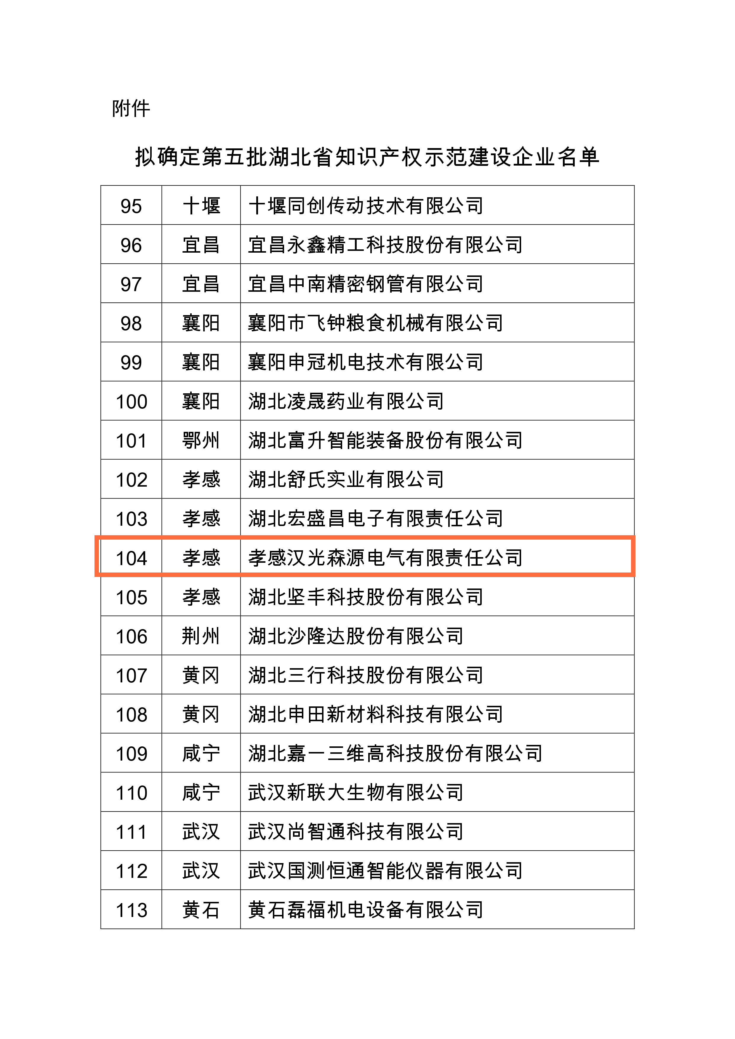 熱烈慶賀孝感漢光森源電氣有限責任公司擬確認為第五批湖北省知識產權示范建設企業,并喜獲5萬元獎勵金。